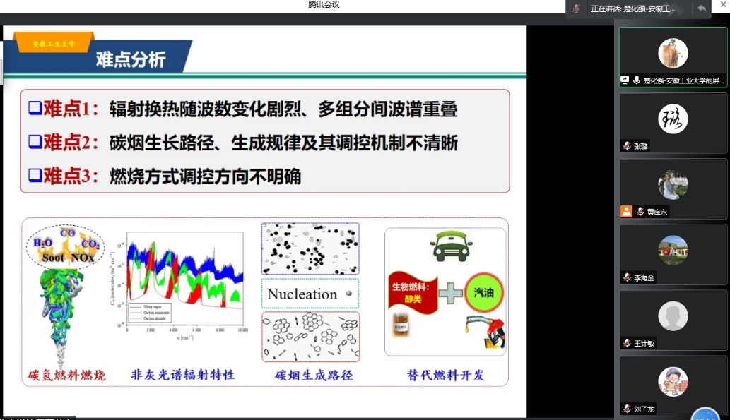 副院长楚化强教授以“气液碳氢燃料燃烧基础研究”为题为本院师生作了一场精彩的学术报告,报告通过线上会议方式进行,由能动系系主任黄庠永主持,部分学院领导、校内外教师和学生近百人聆听了报告。