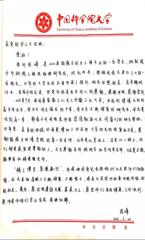 宝剑锋从磨砺出,2020年周峰保送至中国科学院工程热物理研究所攻读硕博研究生。他用行动展现了有梦就去追的可贵精神,为低年级学生树立刻苦勤奋、奋发向上的榜样典型。(附:周峰写给母校的信)