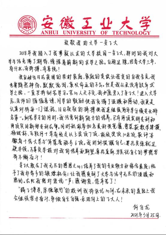有志者事竟成,在学院领导和老师的关怀鼓励下,凭借顽强的意志及积极进取的心态,何自龙同学于2022年保送至北京大学攻读硕士研究生。(附:何自龙写给母校的信)