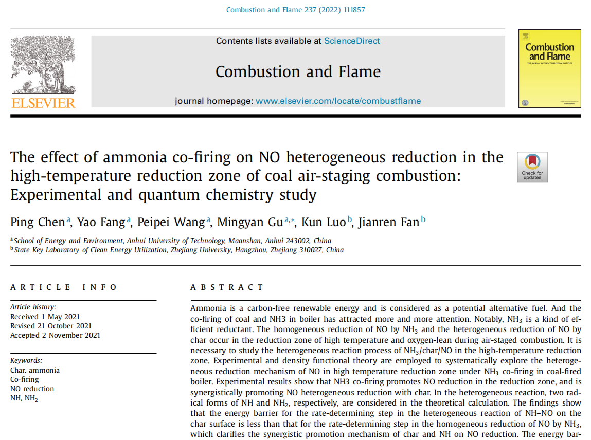 青年教师陈萍在燃烧领域国际权威期刊《Combustion and Flame》上,以第一作者身份发表了题为“The effect of ammonia co-firing on NO heterogeneous reduction in the high-temperature reduction zone of coal air-staging combustion: Experimental and quantum chemistry study”的论文。该论文通讯作者为肉视频AV