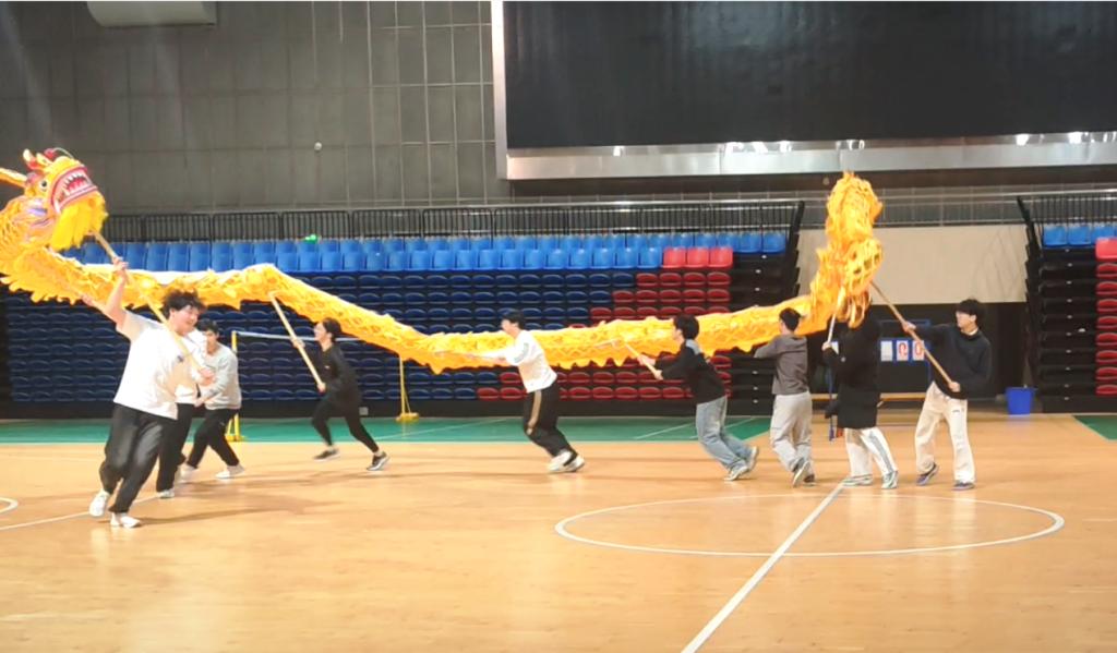 体育馆内,体育舞蹈集训同步进行。潘咏和搭档反复练习着基本步伐和队形变换,对每个手势、每个转身都精益求精。而舞龙队的训练则格外引人注目,长长的龙身在他们默契配合下翻腾起伏,栩栩如生。处于舞龙的关键位置的程伟栋和芦俊杰分享道:“协调性要求很高,我们每天都在磨合,这需要所有队员的共同配合,希望练好了能为学校争光。”