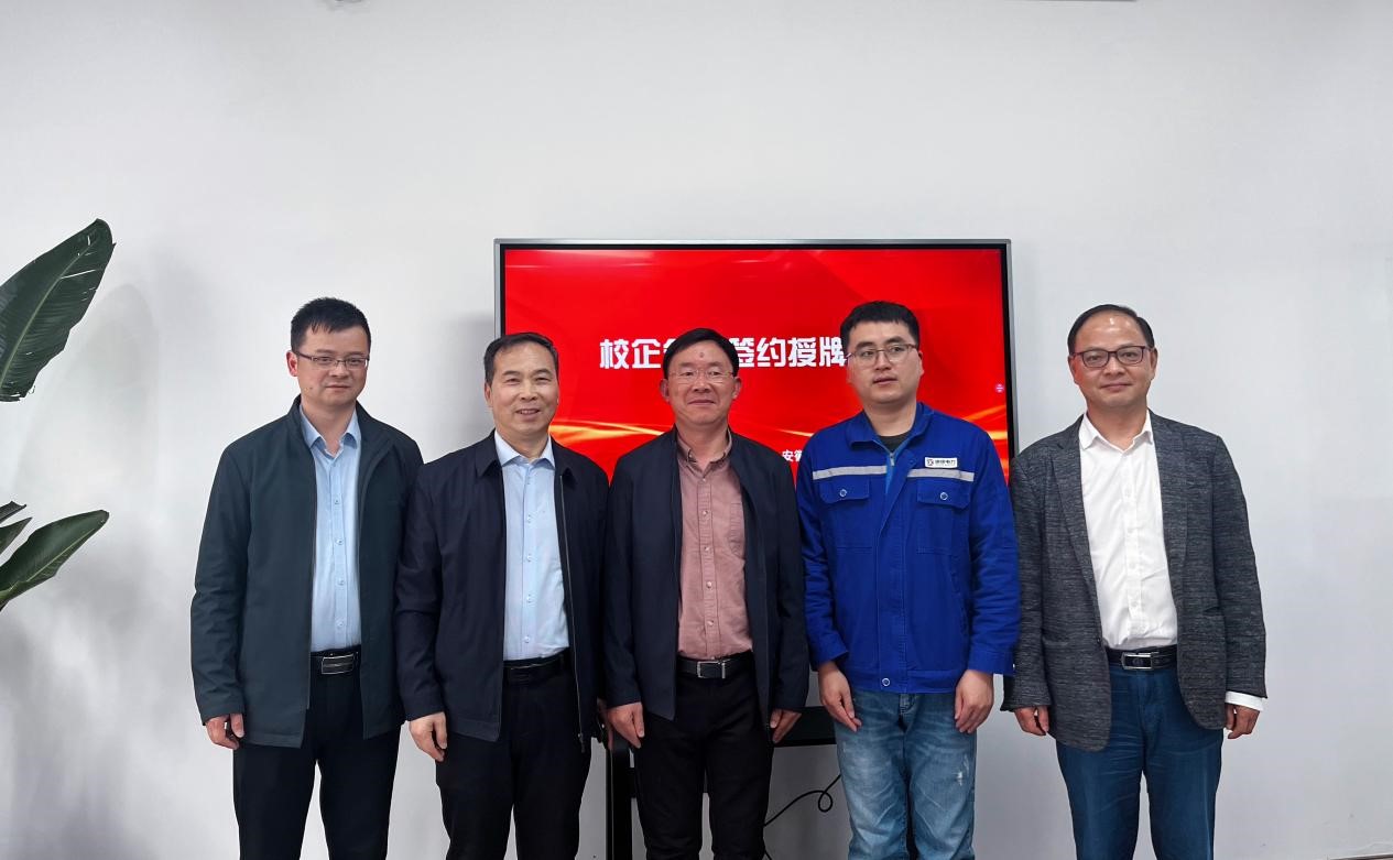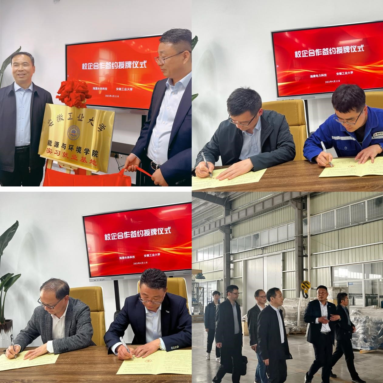 产学研合作基地”揭牌。学院党委副书记谢文平和教学副院长盛广宏分别与四家企业签订了大学生就业基地协议和实习基地协议。与会人员在企业负责人的陪同下一同参观了海澄水务科技集团有限公司和东方日升(安徽)新能源有限公司生产车间。