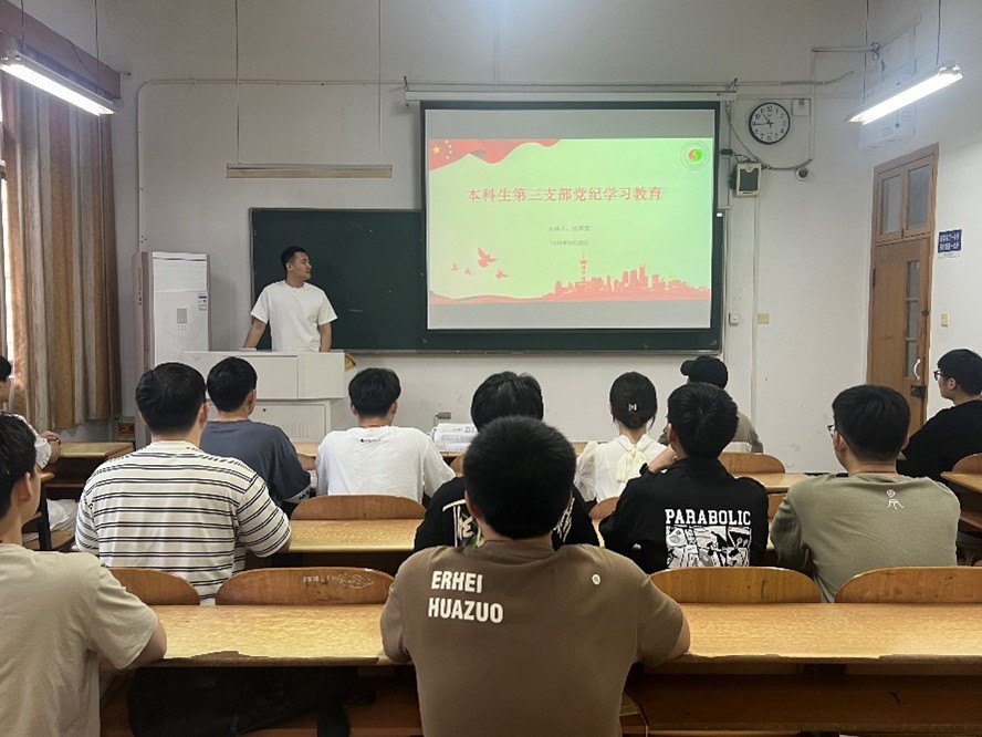 本科生第三支部以学习贯彻新修订的《中国共产党纪律处分条例》为主题,开展党纪学习教育专题党课。本科生第三支部全体党员参与本次党课学习,党课由支部书记沈厚发主讲。
