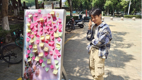 心理协会于佳山校区三食堂门口举办“爱要大声说出来”母亲节主题活动。